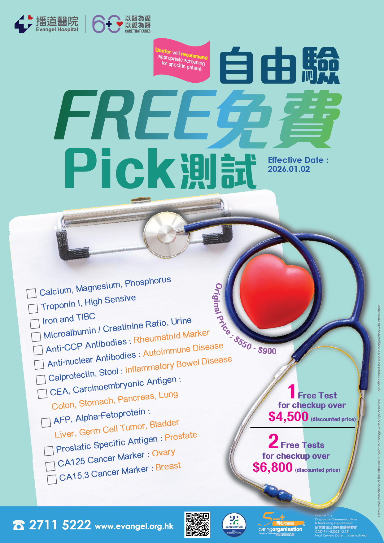 From 2 Jan 2026, anyone who participates in a checkup package of more than HKD4,500 (discounted price) in our hospital could get a "FREE Pick" lab test item for free (which worth $500 to $900), Free 2 lab test items for checkup package over HKD6,800 (discounted price). The offer is on first come first serve basis.
