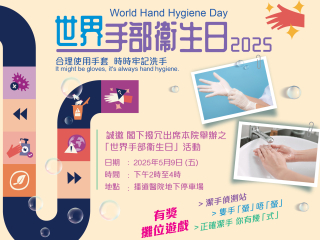 The fifth of May every year is celebrated as “World Hand Hygiene Day”. The theme of this year highlights "It might be gloves. It’s always hand hygiene," emphasizing that even when using gloves, practicing proper hand hygiene habits is crucial for optimal protection. To raise community awareness about the importance of hand hygiene, Evangel Hospital will hold a "World Hand Hygiene Day" event. Through tests and games, participants will learn correct hand hygiene knowledge, fostering a healthy community environment together with the hospital and neighbors.   Event Details: Date: May9, 2025(Friday) Time: 2:00 PM to 4:00 PM Location: Evangel Hospital Underground Parking Lot(If affected by rain, the event will be moved to the 3rd-floor auditorium. Please stay updated on announcements for arrangements.)   Activities: Hand Hygiene Detection Station: Test your hand hygiene level Testing hand bacteria: Observe your handwashing technique Effective Hand Hygiene Tips: Learn the most efficient handwashing methods     Enquiry & Appointment Tel:  2760 3402