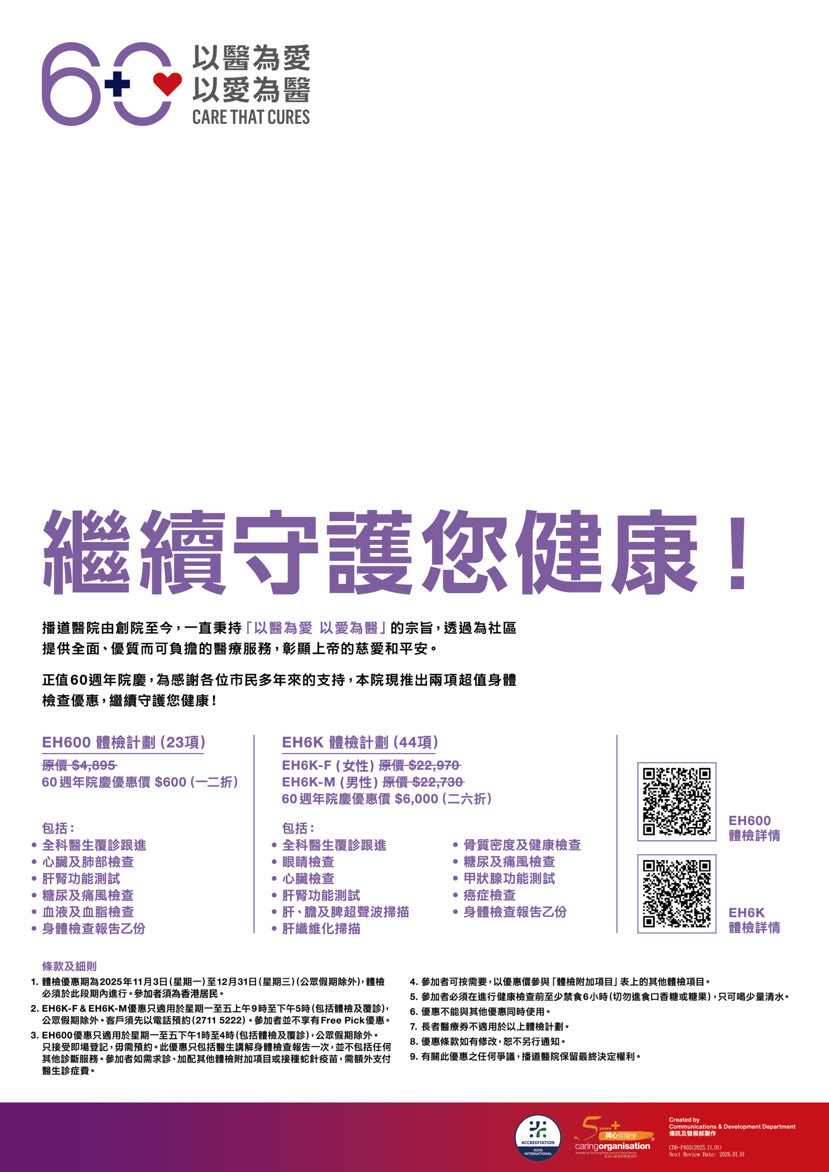 This year marks the 60th anniversary of Evangel Hospital—a significant milestone in our journey. Since our founding, we have upheld the philosophy of “Care that Cures,” dedicated to providing comprehensive, high-quality, and affordable healthcare services to the community. We believe that good healthcare comes not only from professional skills, but also from love and care.