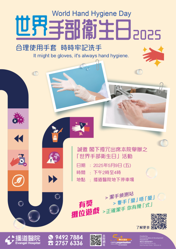 每年的5月5日是「世界手部衞生日」。本年度的主題強調「It might be gloves. It’s always hand hygiene」,提醒大家即使使用手套,仍應養成正確的手部衞生習慣,以確保最大程度的防護。為了讓社區了解潔手的重要性,播道醫院將舉辦「世界手部衞生日」活動,透過實測和遊戲學習正確的潔手知識,讓醫院與鄰里友好共同建立健康的社區環境。