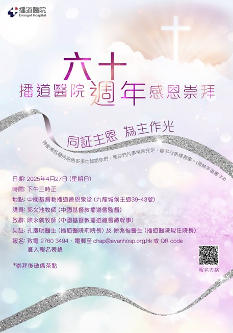 Evangel Hospital is celebrating its 60th anniversary this year. We are grateful for God's guidance and for serving the community throughout these years. We invite you to attend our 60th Anniversary Thanksgiving Worship Service to testify to God's grace and shine for the Lord together.