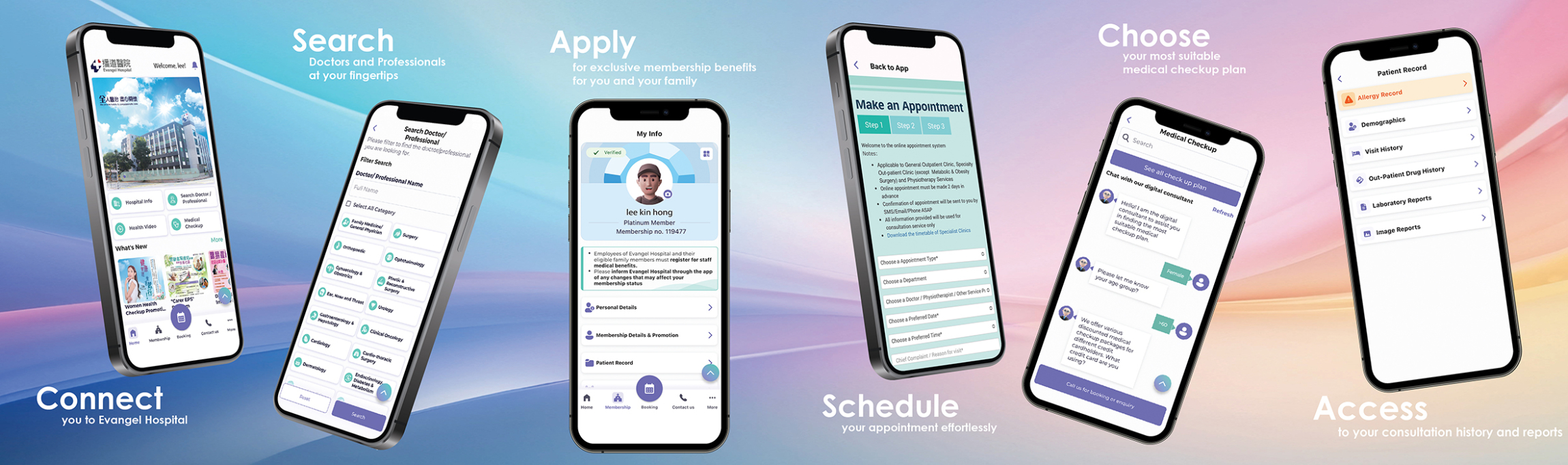 "Evangel Hospital Mobile Application" is designed for enhancing our clients’ journey by facilitating them to manage their medical needs at their fingertips. Users can search for doctors and healthcare professionals, make appointments, get the latest information on medical checkup and other discounted offers, and access your medical record. Registration as a member of the Evangel Hospital can also be made online for enjoying various privileges throughout the years.