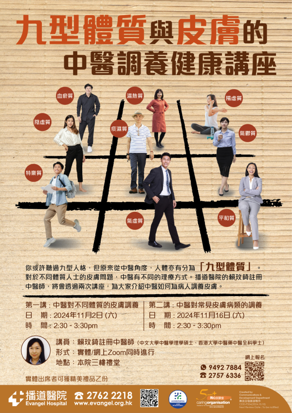从中医角度,人体分为「九型体质」。对于不同体质人士的皮肤问题,中医有不同的理疗方式。透过体质评估,中医师可以从根源为病人调养体质以解决皮肤问题。播道医院註册中医师赖玟锜女士将透过两次免费讲座详细讲解,第一讲将介绍「九型体质」及不同体质的皮肤调养,第二讲将讲述常见皮肤病类的调养。有关详情如下: