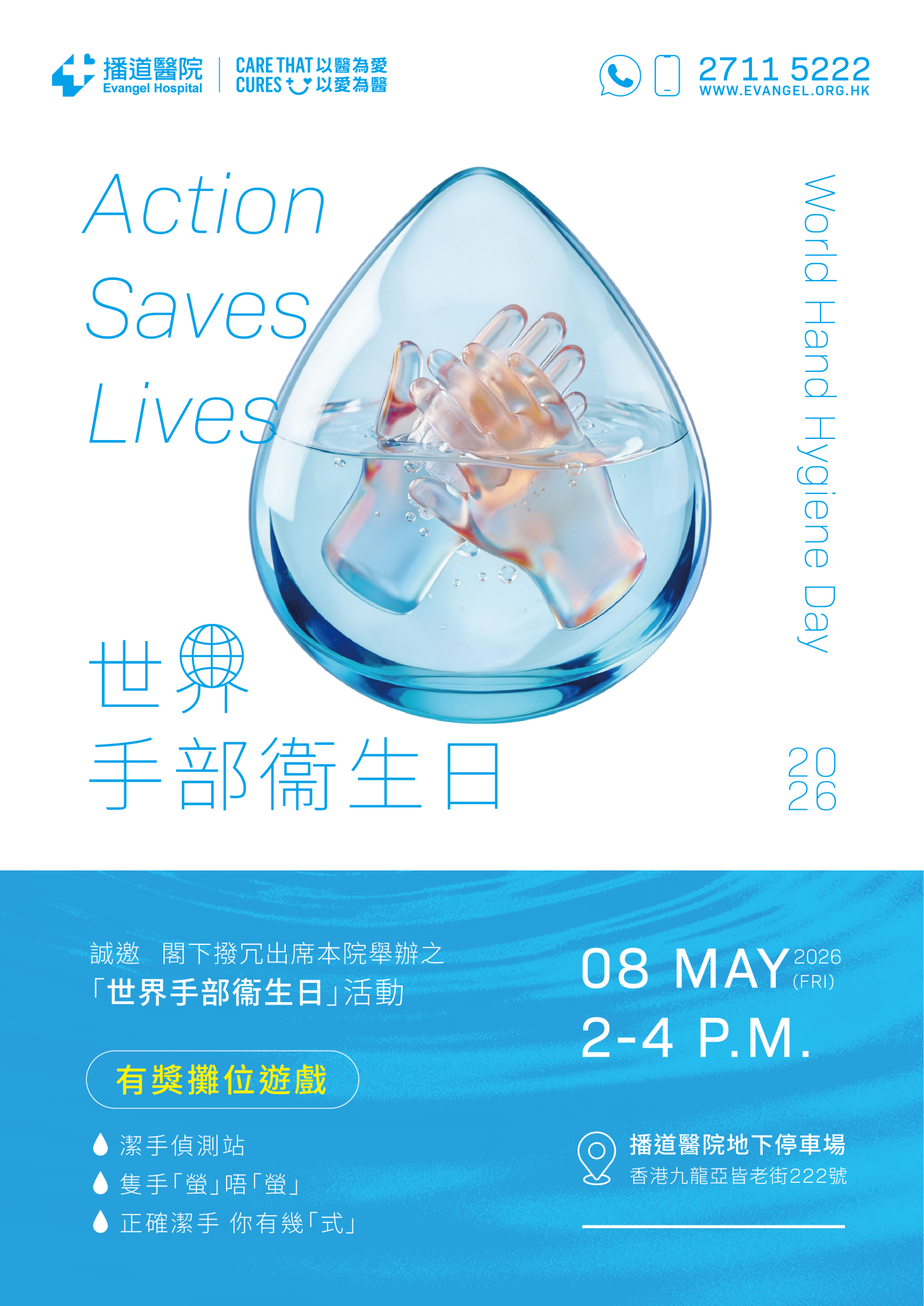 每年的5月5日是「世界手部衞生日」。本年度的主题是调「Action Saves Lives — 行动拯救生命」。一个简单的洁手动作,就能有效阻止病毒和细菌的传播,保护病人、医护人员,甚至整个社区的健康。播道医院将于 5月8日举办「世界手部衞生日」活动,透过游戏体验,让大家掌握正确洁手方法,提升防感染意识。诚邀您一同参与,用双手守护自己与他人,共同建立更健康的社区!