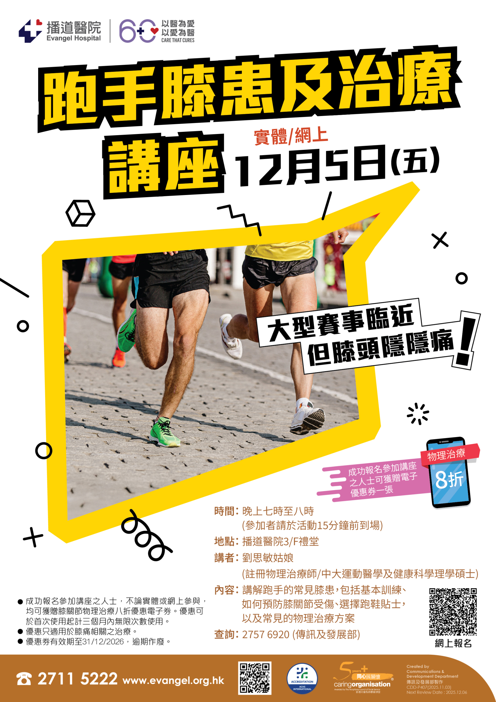 作為熱愛長跑的運動愛好者,膝頭痛是最令人擔心的隱憂。為了讓大家了解膝患成因及正確處理方法,播道醫院將舉辦一場專為跑手而設的膝患及治療的免費講座,助你跑得更遠、更安心。