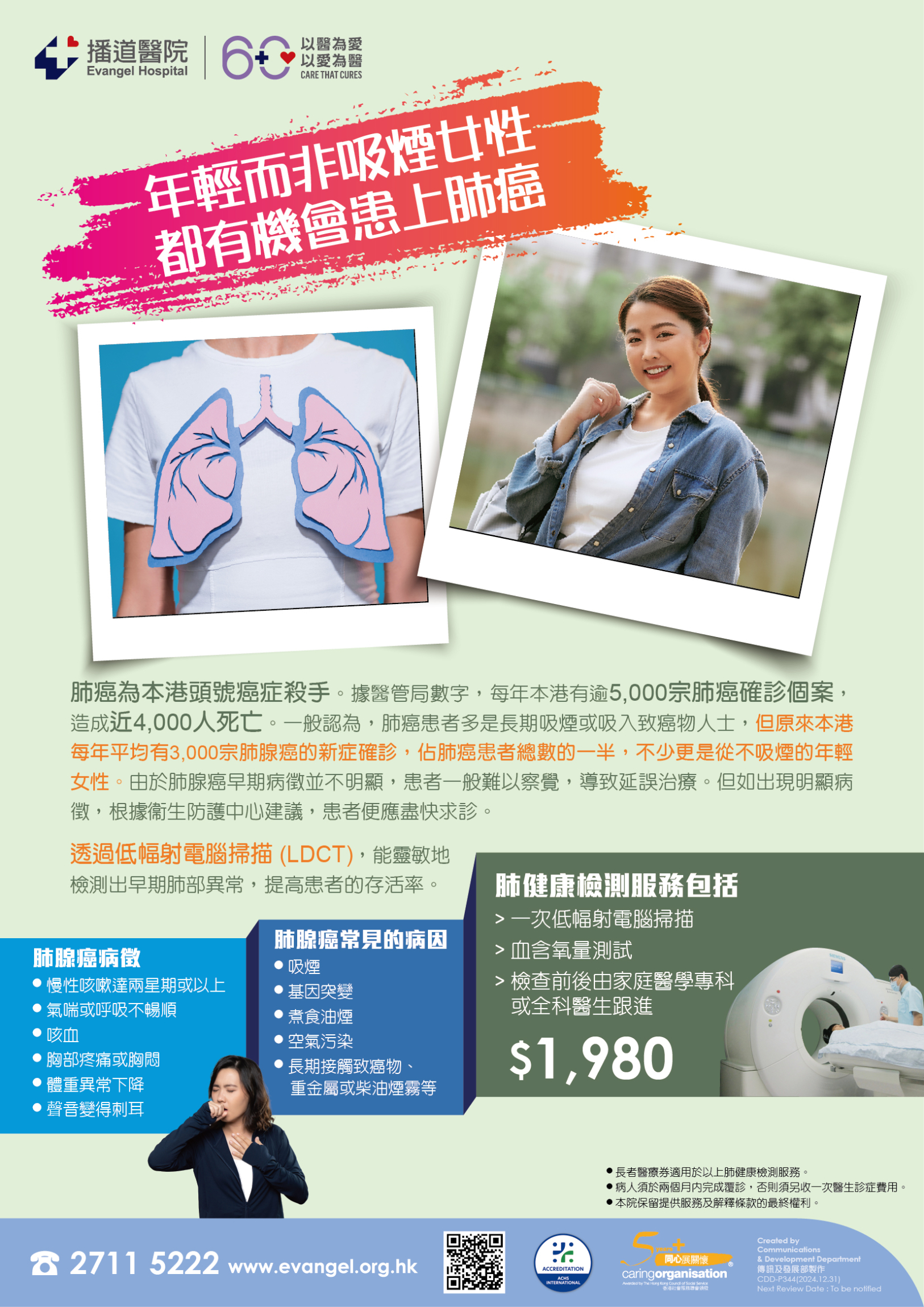 肺癌為本港頭號癌症殺手,每年有逾5,000宗確診個案,造成近4,000人死亡。一般認為,肺癌患者多是長期吸煙或吸入致癌物人士,但原來本港每年平均有3,000宗肺腺癌的新症確診,佔肺癌患者總數的一半,不少更是從不吸煙的年輕女性。由於肺腺癌早前病徵並不明顯,患者一般難以察覺,導致延誤治療。衞生防護中心建議,如有病徵,應盡快求診。透過低幅射電腦掃描 (LDCT),能靈敏地檢測出早期肺部異常,可提高患者的存活率。
